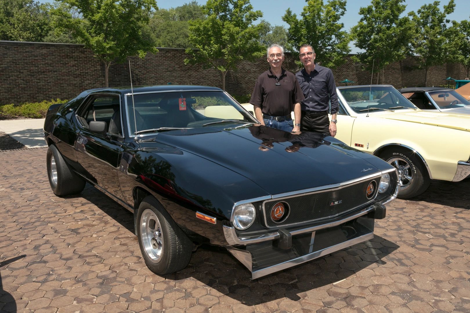 Dave Brigolin with his 1974 AMX, Brig's Trick, that he has owned over 40 years on the historic GM Design Center Patio, with Mike Simcoe, Design V.P.